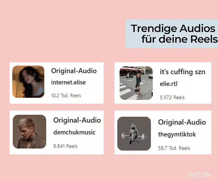 Die Einbindung von trendigen Audios in deine Reels ist eine zusätzliche Möglichkeit, Reichweite zu erhöhen. Du erkennst trendige Sounds an dem kleinen Pfeil neben dem Namen des Audios. Deine beste Chance auf einen Boost besteht darin, Sounds zu nutzen, die noch nicht zu viele konkurrierende Reels haben. Achte also bei der Auswahl des richtigen Sounds darauf, Audios, die weniger als 30.000 Mal genutzt wurden, zu verwenden. So sicherst du dir mehr Aufmerksamkeit für politische Themen, über die du sprechen möchtest.