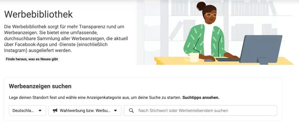 Übrigens: Politisch und gesellschaftlich relevante Werbeanzeigen müssen auf Facebook und Instagram als solche gekennzeichnet werden. Ist das nicht der Fall, wird die Werbeanzeige nicht veröffentlicht. Das soll Fake News und das Beeinflussen von Wahlergebnissen im Ausland eingrenzen. In der sogenannten Facebook Werbebibliothek sind alle politisch gekennzeichnete Werbeanzeigen der sozialen Medien Facebook und Instagram gelistet. Bei jeder Anzeige steht folgendes: