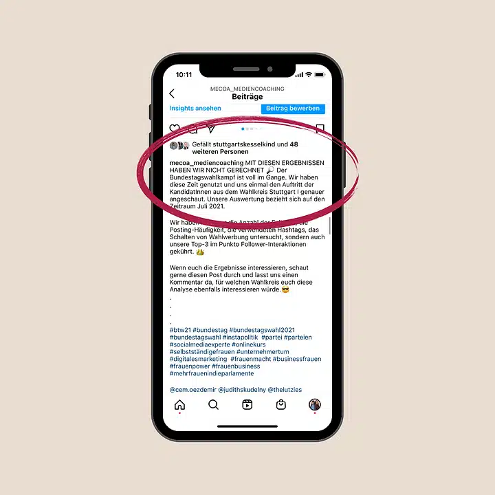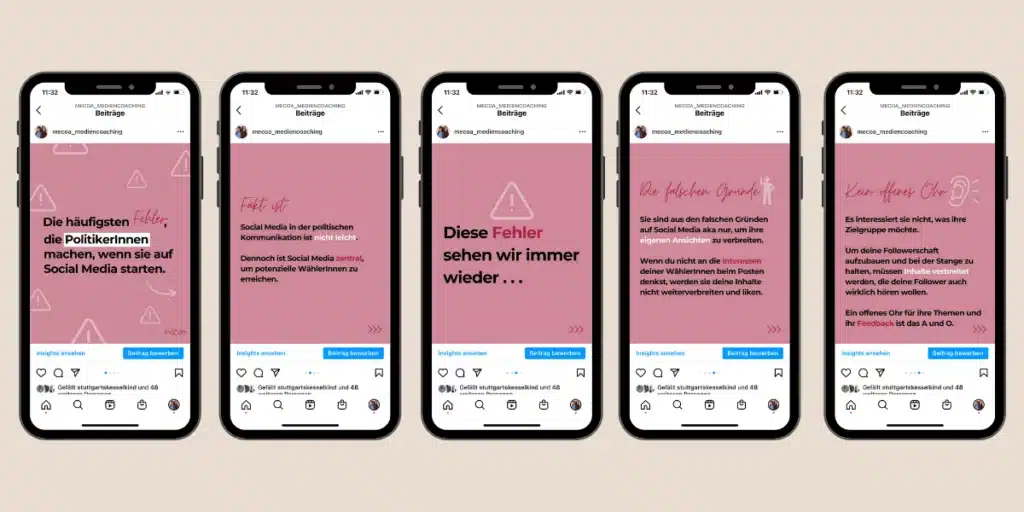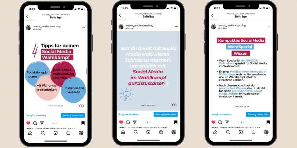 Sogenannte „Kacheln“ werden gerne in der Politik als auch in der Wirtschaft eingesetzt, um die Message der Post-Beiträge bereits auf den ersten Blick sichtbar zu machen. Doch nicht nur deshalb sind sie so beliebt. Das Auge braucht auch länger, um den Text zu erfassen. So wird der Daumen beim Scrollen automatisch gestoppt. Die Verweildauer erhöht sich und das ist gut für dein Instagram Algorithmus.