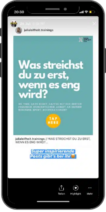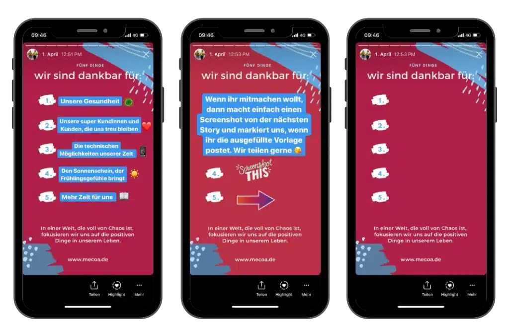 Hier solltest du vor allem darauf achten, dass du ein Template nutzt, das einfach und verständlich ist (siehe Beispiel oben). Es müssen auf einen Blick die wichtigsten Infos zu sehen sein, sodass der Leser interessiert ist, mehr erfahren will und auf deine Seite kommt. Rufe bei deiner Aktion unbedingt dazu auf, dass die User deinen Post oder deine Story teilen und deinen Kanal verlinken sollen. So erreichst du auch die Follower deiner Follower und beide Seiten profitieren von der Aktion.