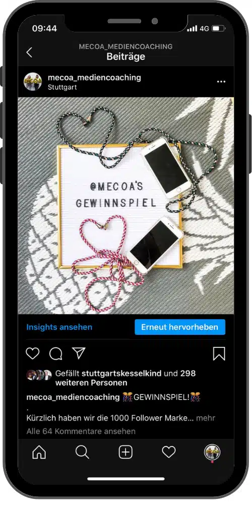 Alternative: Finde Accounts, die eine ähnliche Followeranzahl haben und dessen Inhalte zu deinen Inhalten passen. Im Optimalfall haben eure Kanäle Zielgruppen mit ähnlichen Charakteristika wie beispielsweise das Alter oder Interessen. Mit diesen Accounts geht ihr Kooperationen ein und macht gegenseitig Shoutouts, damit beide von den Followern des jeweils anderen Kanal profitieren. Im Beispiel oben rechts siehst du ein Shoutout, das wir auf unserem mecoa_mediencoaching Instagram Account gemacht haben.