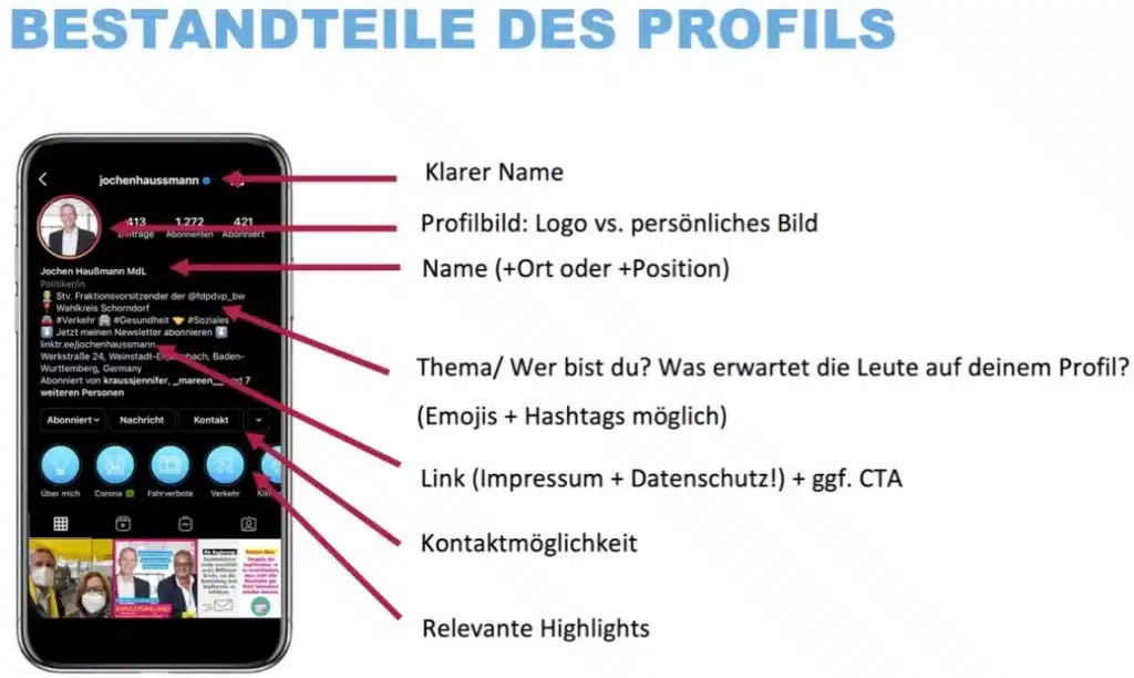 Was alles am besten für deine politische Instagram Bio geeignet ist, sprich was alles hineingeschrieben werden sollte, kannst du in der unten abgebildeten Grafik nachschauen. Dort haben wir dir alle wichtigen Dinge markiert, welche du dringend einfügen solltest.