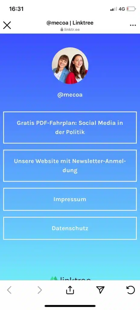 Wie du dein Impressum trotzdem regelgerecht anlegen kannst sagen wir dir jetzt! In einem sogenannten „Linktree“ kannst du alle wichtigen Daten abspeichern. Es wird quasi ein übergeordneter Link erstellt, hinter dem sich mehrere andere Links verbergen. Sprich die ganzen Links zu deinem Impressum und deinem Datenschutz. So hast du alle Daten regelkonform abgespeichert und verstößt gegen keinen Richtlinien. Denn wer Impressum und Datenschutz nich in seiner Instagram Bio integriert hat, der kann schnell gegen die DSGVO verstoßen und kann abgemahnt werden. Wie so ein Linktree aussehen kann, siehst du im unteren Schaubild.