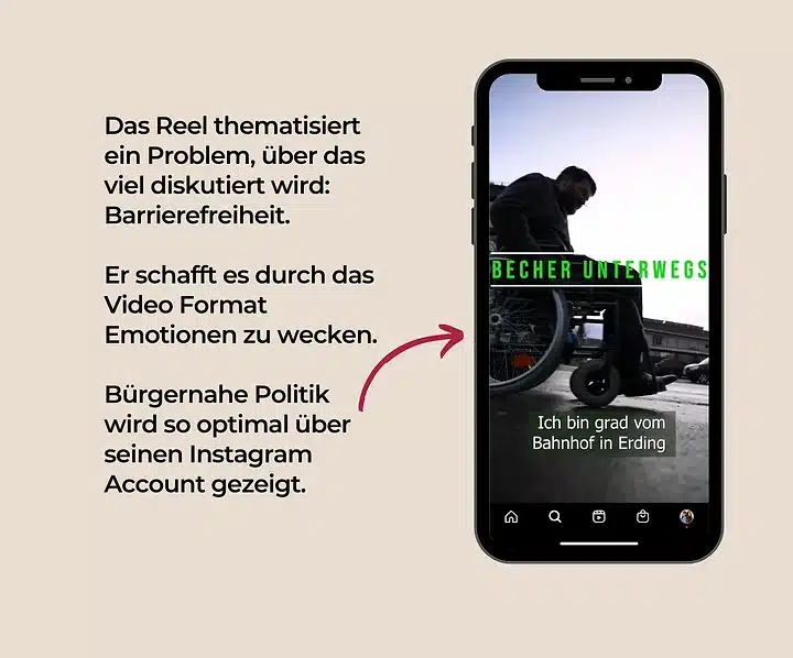 Die 90-Sekündigen Kurzvideos sind eine optimale Variante, sich modern und oft auch mit Witz zu präsentieren. Da Reels einfach direkt in der App Instagram erstellt werden können, sind sie auch ohne Kompromisse für Politiker und Politikerinnen geeignet. Man muss kein Video-Schnittprofi sein.