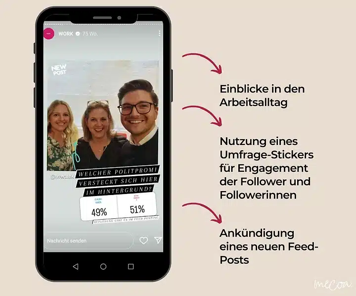 Du kannst über die Stories aber natürlich auch Inhalte mit Mehrwert für deine Follower und Followerinnen teilen. Wie wäre es beispielsweise mit einem Tutorial darüber, wie man eine politische Rede schreibt, nachdem du dies als Tagesaufgabe gezeigt hast. Erhöhe dein Engagement auch durch verschiedene Tools wie Story-, Umfragen-, Fragen- oder Quiz-Sticker. Hier findest du weitere Ideen für reichweitenstarke Stories: Link