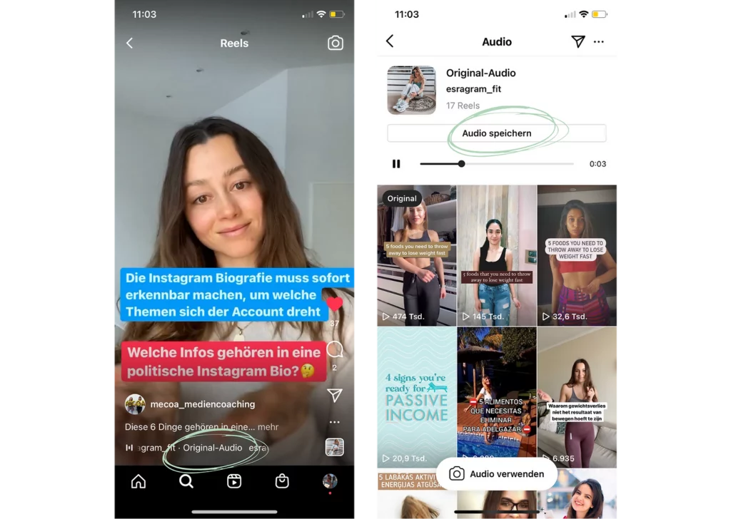 • Audio: Mit der Audio-Funktion kannst du deinem Instagram Reel einen Ton hinzufügen. In der Musikbibliothek gibt es eine große Auswahl an Songs. Du kannst aber auch Sounds verwenden, die andere Nutzer und Nutzerinnen erstellt haben. Wenn du dein Video mit Ton aufnimmst, dann wird dir diese Tonspur zugeschrieben. Musik ist häufig auch fester Bestandteil von Trends, die du adaptieren kannst, um den Algorithmus auszunutzen, der diese pusht.