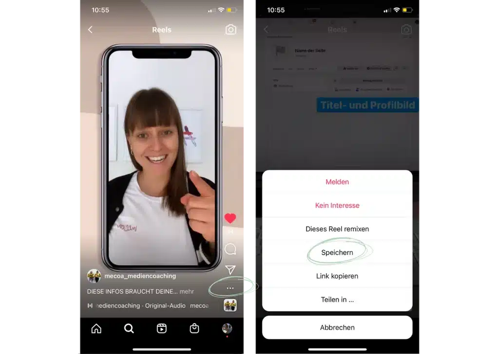Reels, die dir besonders gefallen, speicherst du am besten direkt ab, sodass du zu einem späteren Zeitpunkt wieder darauf zugreifen kannst. Das geht über die drei Punkte rechts unten neben dem Reel.