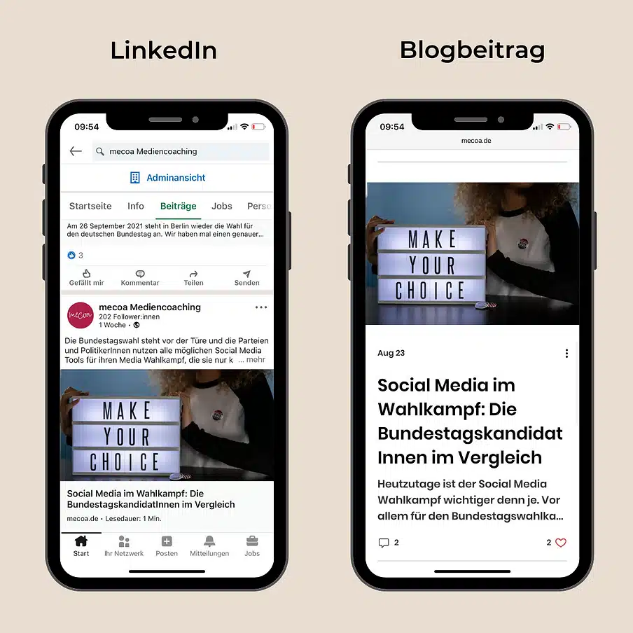 Hast du beispielsweise einen Blogartikel geschrieben, dann teile diesen doch auch direkt auf LinkedIn als LinkedIn Artikel. Somit profitieren nicht nur deine WebsitebesucherInnen von deinem Mehrwert sondern zusätzlich auch noch deine LinkedIn Community.