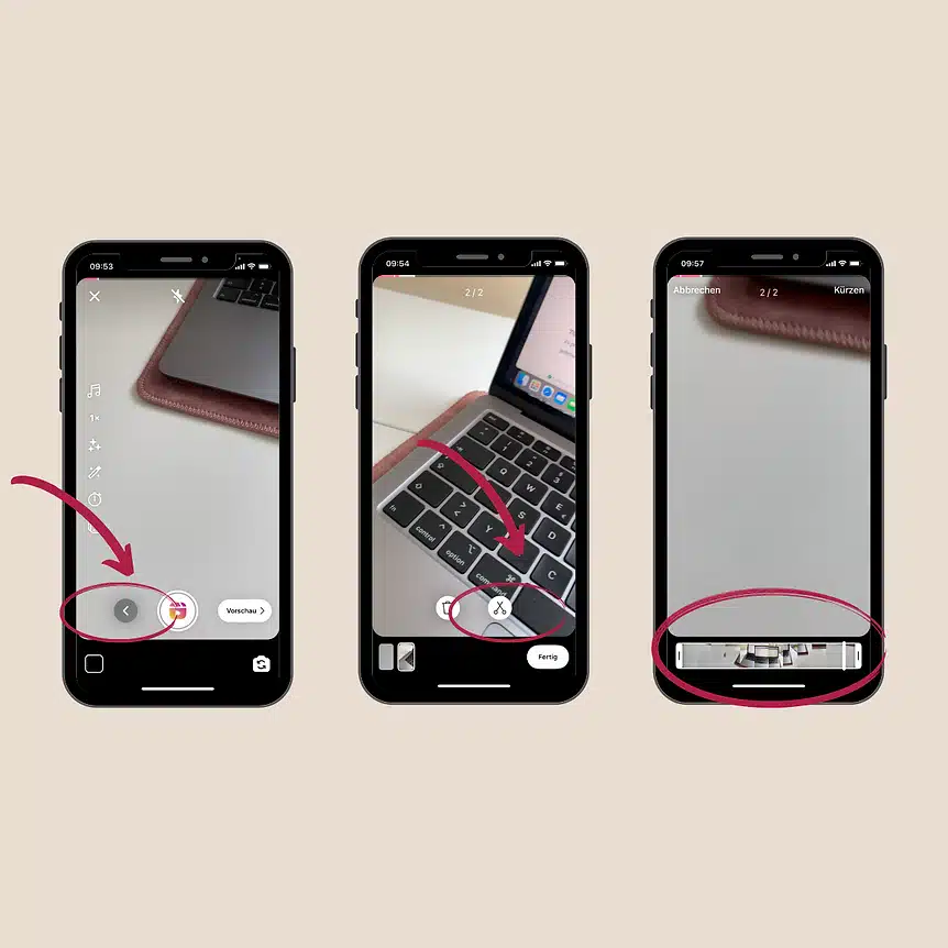 3. Wenn du für ein Reels an mehreren Orten filmen möchtest oder du verschiedene Sequenzen filmen möchtest, ist das auch kein Problem! Nachdem du eine Sequenz gedreht hast, wird diese automatisch gespeichert. Möchtest du die nächste Sequenz filmen, drückst du einfach wieder auf den Aufnahme-Knopf in der Mitte.