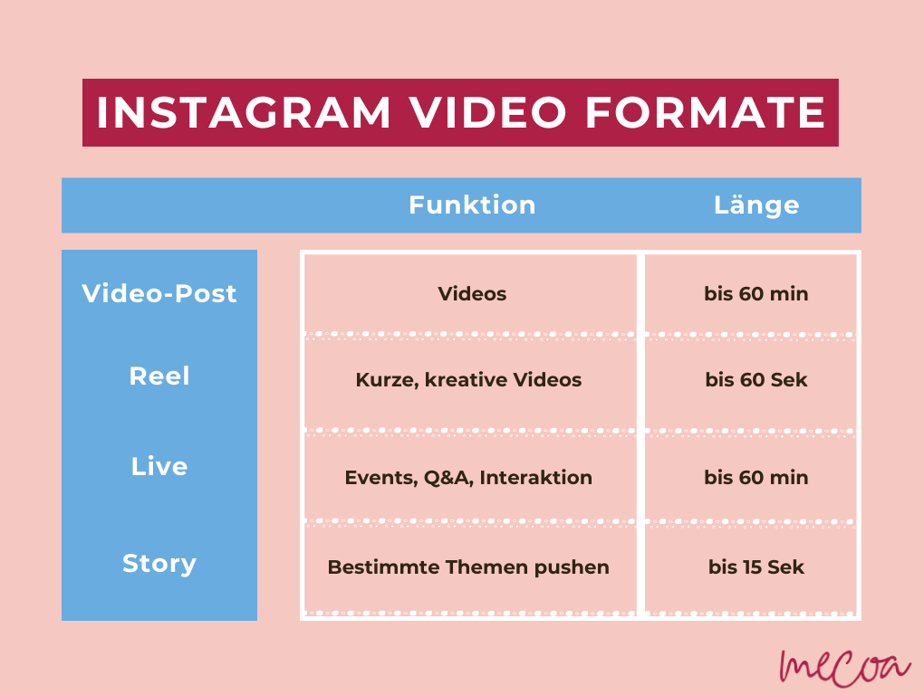 Zum Schluss noch einmal die Instagram Video Formate mit Funktion und Länge im Überblick: