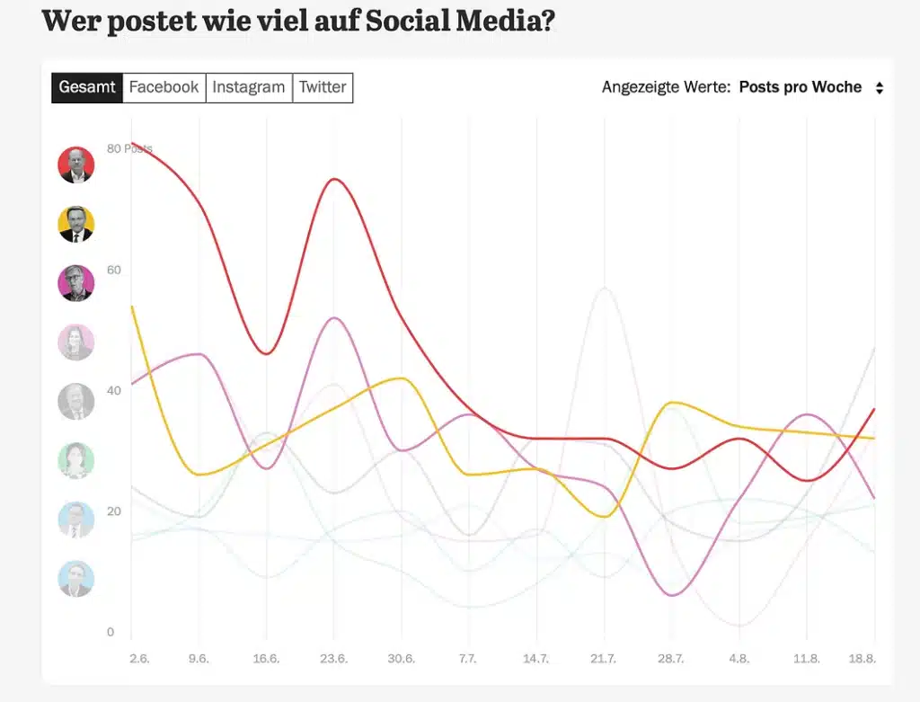 Insgesamt, im Bezug auf alle sozialen Netzwerke, ist die SPD Social Media Spitzenreiter, was die Posting-Häufigkeit angeht, gefolgt von der FDP. Bei der SPD ist der Spitzenkandidat Olaf Scholz und bei der FDP Christian Lindner.