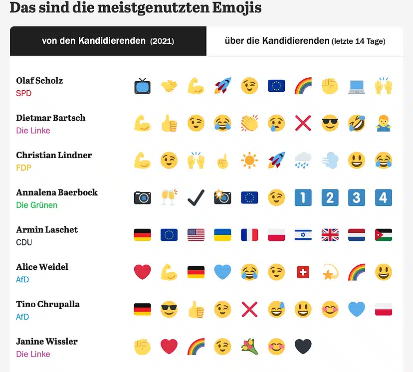 Was wären soziale Netzwerke ohne die lustigen und bunten Emojis unter einem Facebook, Twitter oder Instagram Post. Sie sehen nicht nur gut aus, sondern können wichtige Botschaften unterstreichen. Auch die KandidatInnen, welche dieses Jahr an der Bundestagswahl teilnehmen, nutzen die verschiedensten Emojis unter ihren Posts in den sozialen Medien. Über Lachsmileys , Daumen hoch oder Länderflaggen ist alles erlaubt und mit dabei. Aber welche Emojis werden am meisten im Jahr 2021 von den KandidatInnen verwendet?