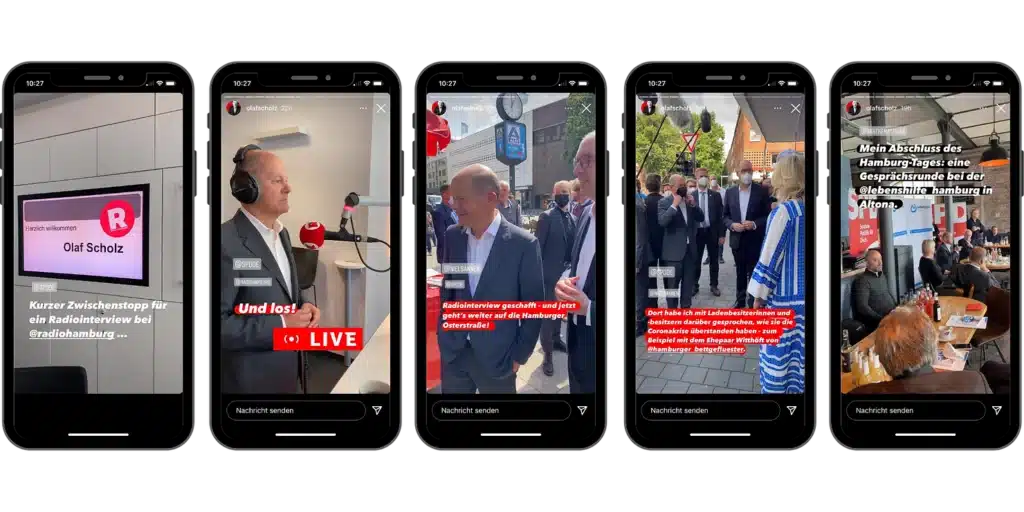 Wenn du im Wahlkampf interessante Pressetermine, Unternehmensbesuche, Interviews, Veranstaltungen, usw. auf der Agenda hast, dann nimm deine Community doch einfach täglich in deinen Stories mit. So können sie sehen, wie dein politischer Alltag aussieht und was du tust, um deine Forderungen durchzusetzen. Hier ein Beispiel, wie Olaf Scholz seine Community in seinen Instagram Stories täglich mitnimmt.