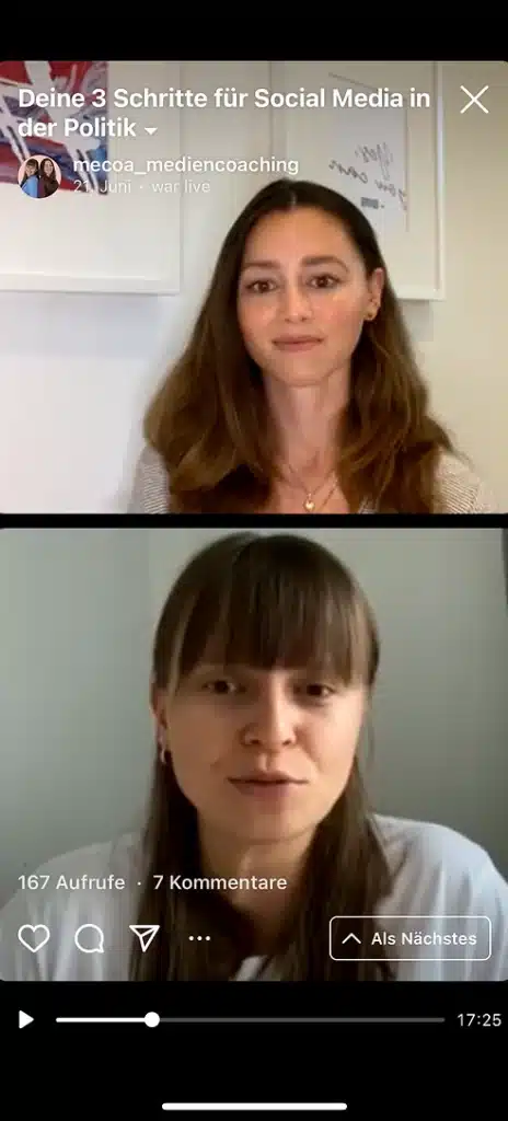 Dafür brauchst du nicht viel: eine kurze Vorbereitung zu dem Thema, das du ansprechen willst, und schon kann es losgehen. Du musst währenddessen und im Nachhinein nichts schneiden oder überarbeiten, sondern kannst das Video direkt, nachdem du live warst, in deinem Feed speichern. Kleiner Tipp: Such dir interessante und spannende Gesprächspartnerinnen und -partner.