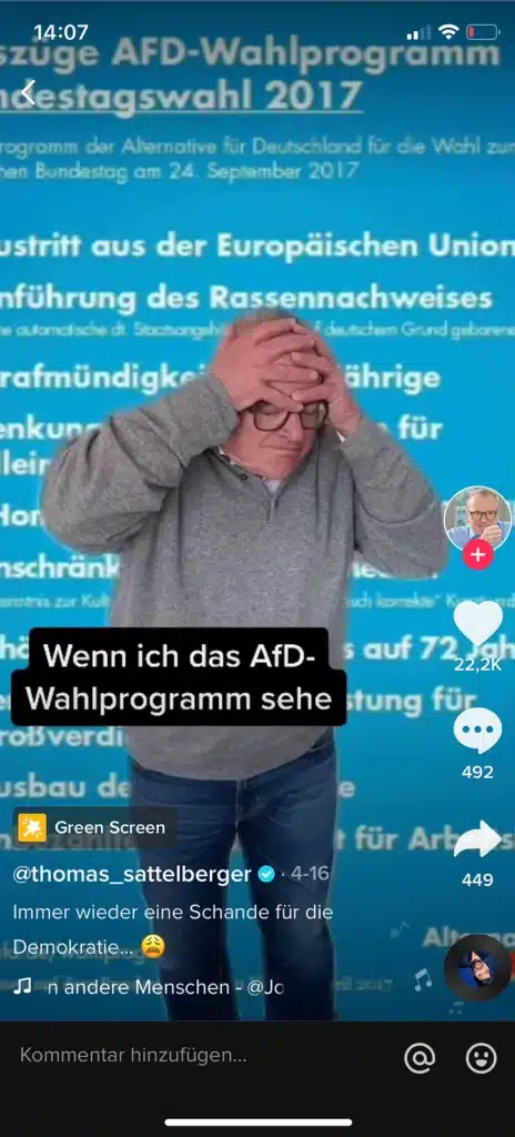 Wichtig zu wissen: TikTok spricht vorwiegend sehr junge NutzerInnen an. 73% der NutzerInnen sind zwischen 13 und 24 Jahren und gehören somit zur jüngsten Generation – die Generation, die alles schnell und auf den Punkt gebracht erfassen will und so oft und lange auf Social Media unterwegs ist, dass sie sich quasi ständig von Inhalten berieseln lassen. Sind die Posts nicht besonders genug, wird einfach weiter gescrollt. Auf dieser Social Media Plattform ist es also wichtig, dass deine politischen Videos zu der jüngeren Generation passen, um anzukommen. Denn nur 24% der Nutzer sind zwischen 25 und 44 Jahren bzw. kaum zu nennende 3% sind 45 Jahre und älter.
