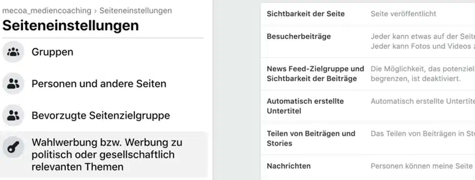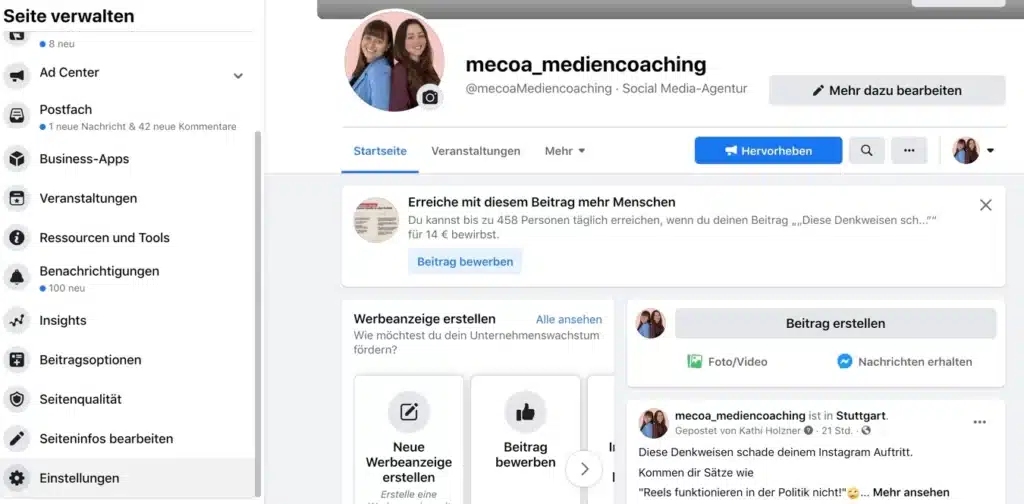 Um den ganzen Prozess für politische Werbung durchgehen zu können, musst du zunächst die Facebookseite aufrufen, um die es geht. Klicke im linken Bereich auf Einstellungen.