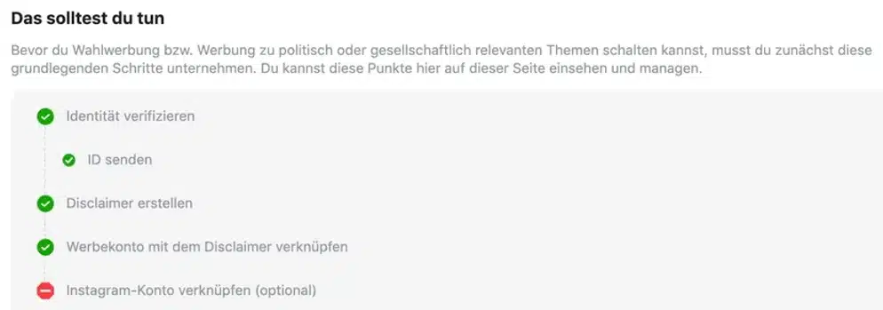 - Werbetreibenden müssen einen Autorisierungsprozess in dem Land durchlaufen, in dem sie politische Werbung schalten wollen. Dabei müssen Werbetreibende entsprechende Dokumente zurr Identitäts- und Standortprüfung vorweisen. Ziel ist, dass sichergestellt ist, dass Personen, die in einem Land Wahlwerbung oder Werbung zu Themen von nationaler Relevanz schalten, sich in dem entsprechenden Land befinden und somit durch Ads keine Wahlen im Ausland beeinflussen können.