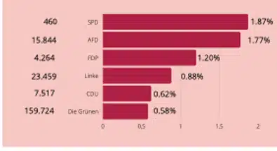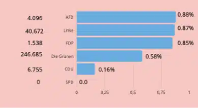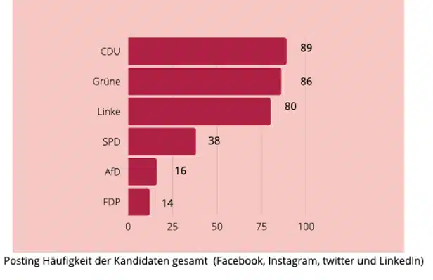 Auf Twitter posten die meisten Parteien am liebsten. Wie zum Beispiel die FDP, die Linke und die Grünen. Ihre Interaktionsrate ist aber noch ausbaufähig. Besonders verwunderlich ist, dass die SPD Kandidatin aus dem Wahlkreis Stuttgart I Lucia Schanbacher gar kein Twitter Profil besitzt.