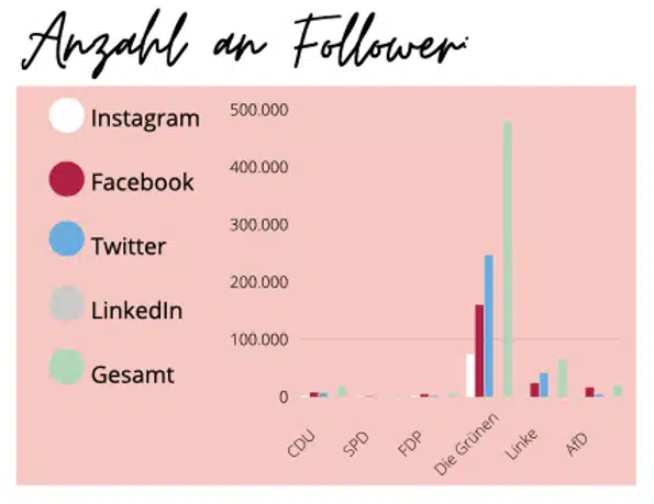 Wir haben uns die Followeranzahl auf den Social Media Plattformen Instagram, Facebook, LinkedIn und Twitter der 6 KandidatInnen aus dem Wahlkreis Stuttgart I genauer angeschaut und sind auf interessante Fakten gestoßen. Das oben abgebildeten Schaubild zeigt die Anzahl der Follower auf den einzelnen Social Media Kanälen und die Gesamtzahl der Follower auf allen Plattformen. Daraus geht hervor, dass Cem Özdemir, die meisten Follower (Summe der Follower aller Plattformen: 479.662 Follower) hat. Die KandidatInnen der SPD und FDP haben die wenigsten Follower (1.573 und 7.405 Follower), auf den einzelnen Plattformen und auch Insgesamt. Die KandidatInnen von der CDU, den Linken und der AfD spielen im Mittelfeld was die Followerzahl angeht (CDU 18.921, AfD 20.702 und die Linke 65.217 Follower).