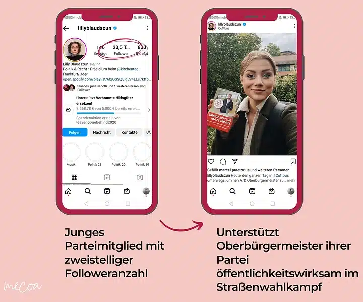 Besonders vor der Bundestagswahl hat sich gezeigt, dass es wichtig ist, mit Reels und einer starken Hook auf die Aufmerksamkeit von Menschen mit politischem Interesse zu setzen. Die Parteien von den politischen Rändern haben es vor allem bei den Ergebnissen unter den jungen Wählern und Wählerinnen gezeigt. Die Reichweite der AfD ist auch TikTok beispielsweise viermal so hoch wie die Grünen, die CDU/CSU, die SPD und die FDP zusammen haben.