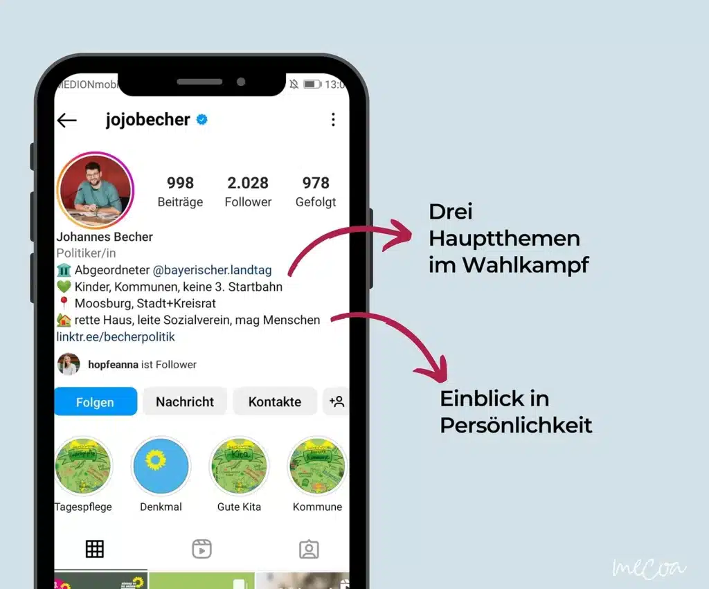 Veröffentliche in deinem Online Wahlkampf beispielsweise einen Beitrag mit deinen persönlichen Bezugspunkten und Geschichten bezüglich deiner Themen.