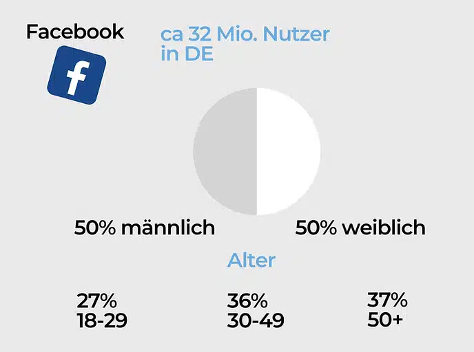 Mark Zuckerberg – jeder kennt seinen Namen. 2004 gründete er die Social Media Plattform Facebook und leitet sie nun mit knapp 45.000 Mitarbeitern (Stand 2019). Die Geschichte von Facebook ist spektakulär und trotz aller Kritiken ist Facebook immer noch die nutzerstärkste Social Media Plattform! Mit ca. 32 Millionen Nutzern allein in Deutschland lässt sie Instagram und TikTok weit hinter sich. Das spricht natürlich zunächst dafür, dein Business auf Facebook aufzubauen. Die Nutzermenge ist aber nicht alleine entscheidend: Die Zielgruppe auf Facebook spielt auch eine zentrale Rolle.